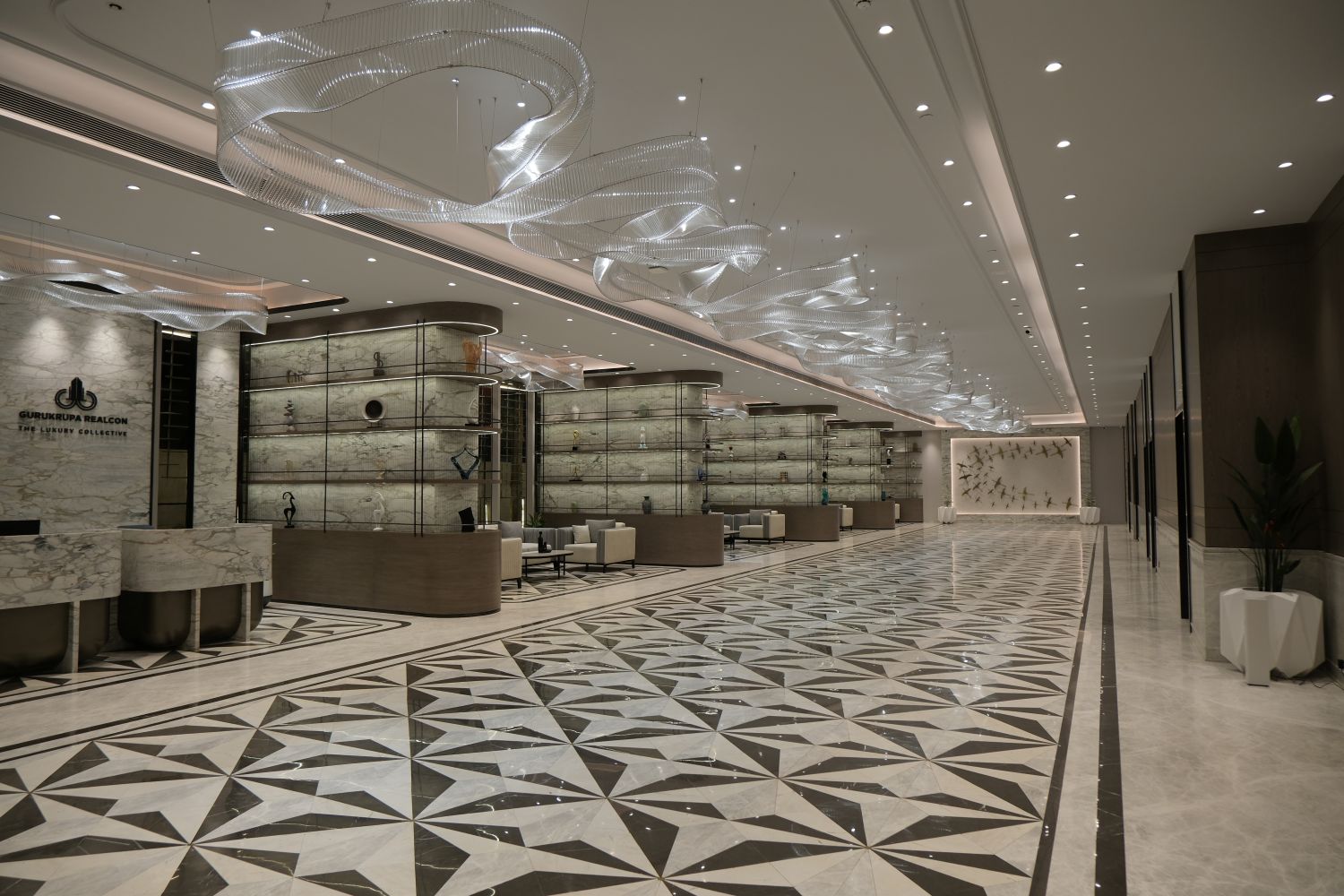 This refined lobby serves as a powerful first point of connection, defined by confident architecture and sculptural design. Flowing ceiling elements, patterned flooring, and layered lighting create a grand yet composed visual rhythm. Curated seating and refined finishes balance openness with intimacy, setting a calm and luxurious tone on arrival.